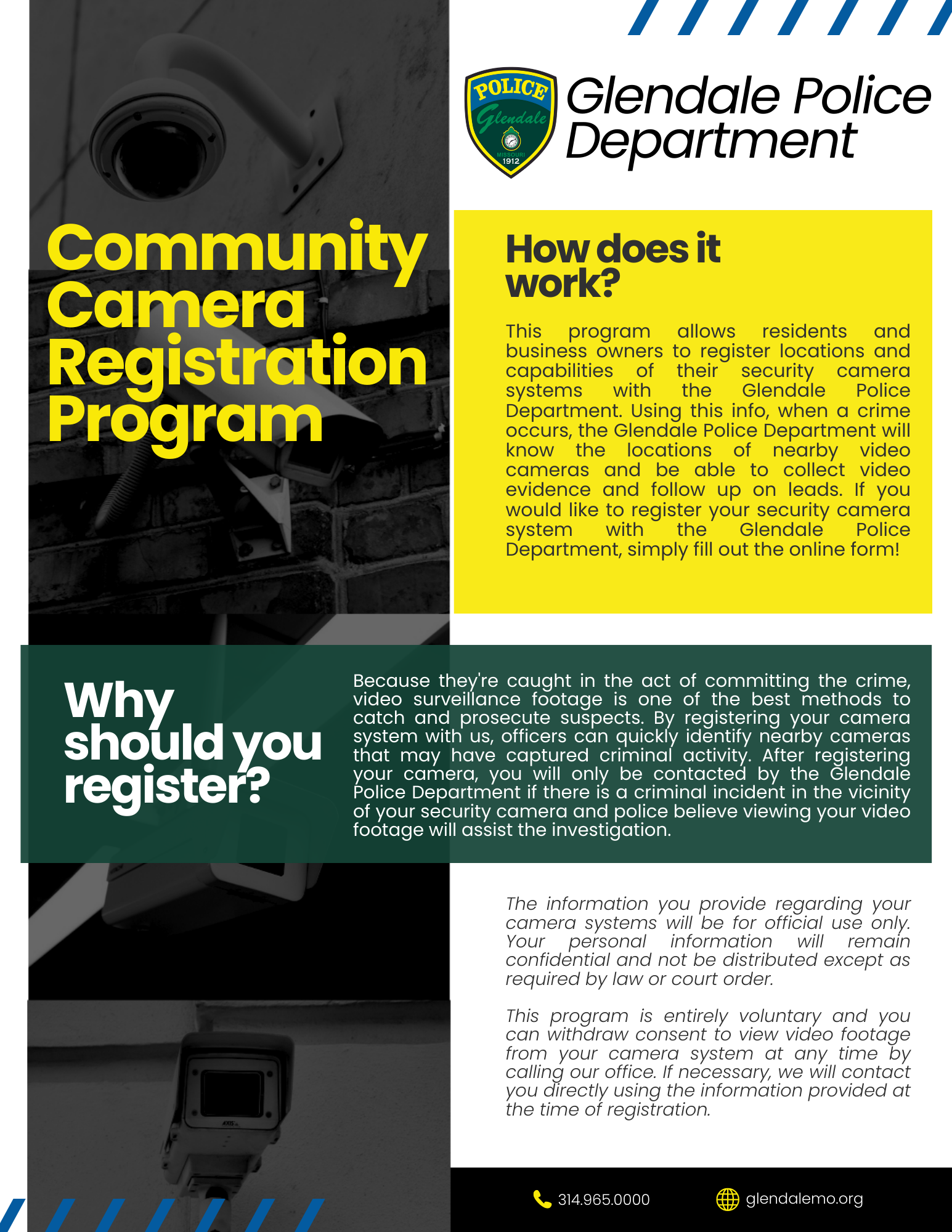 Video surveillance is one of the most effective methods for apprehending criminals and convicting suspects who are caught in the act of committing a crime. Registering your video surveillance is a great example of community-police partnerships and is something the Glendale Police Department values highly.